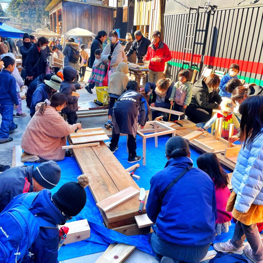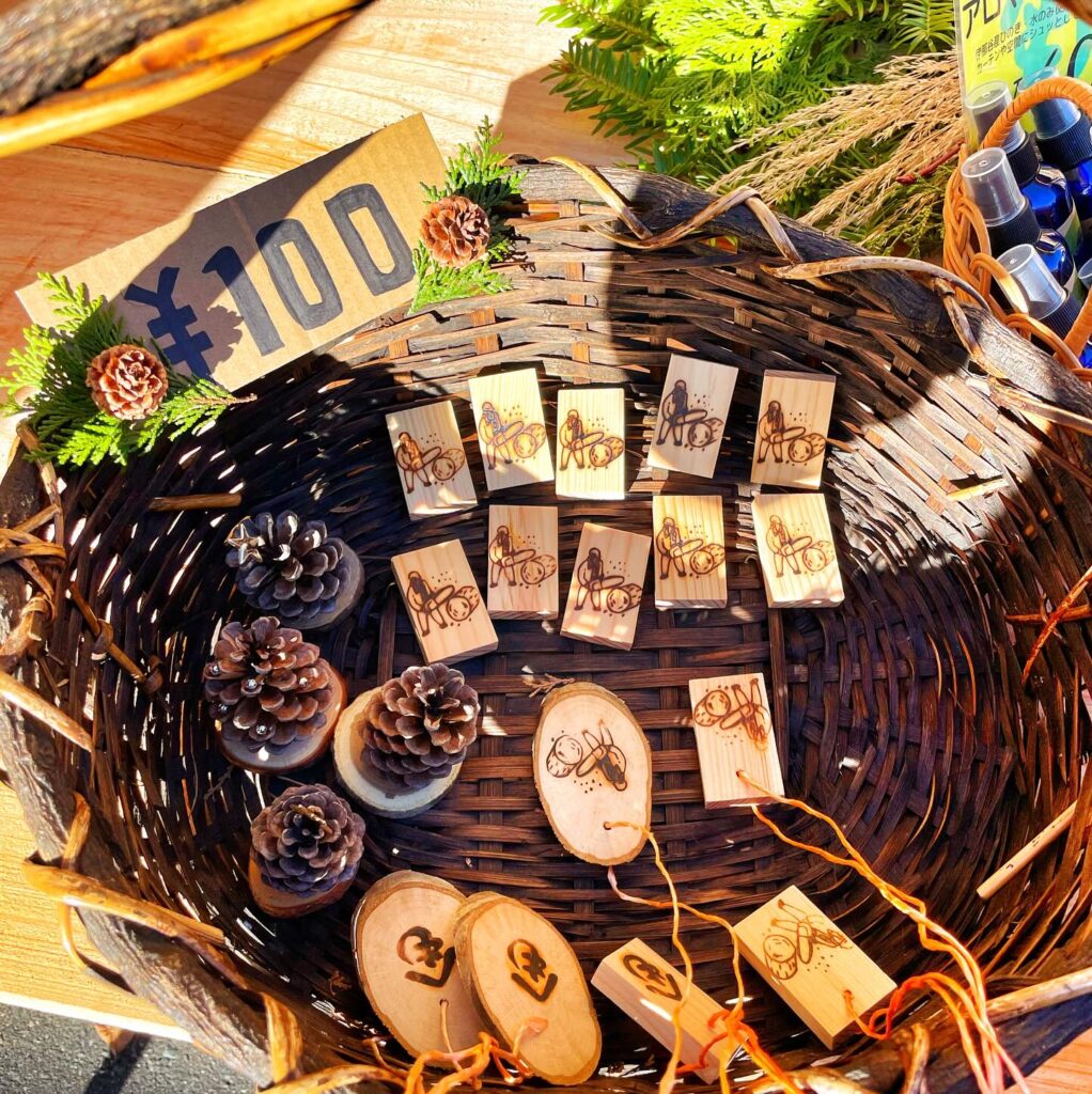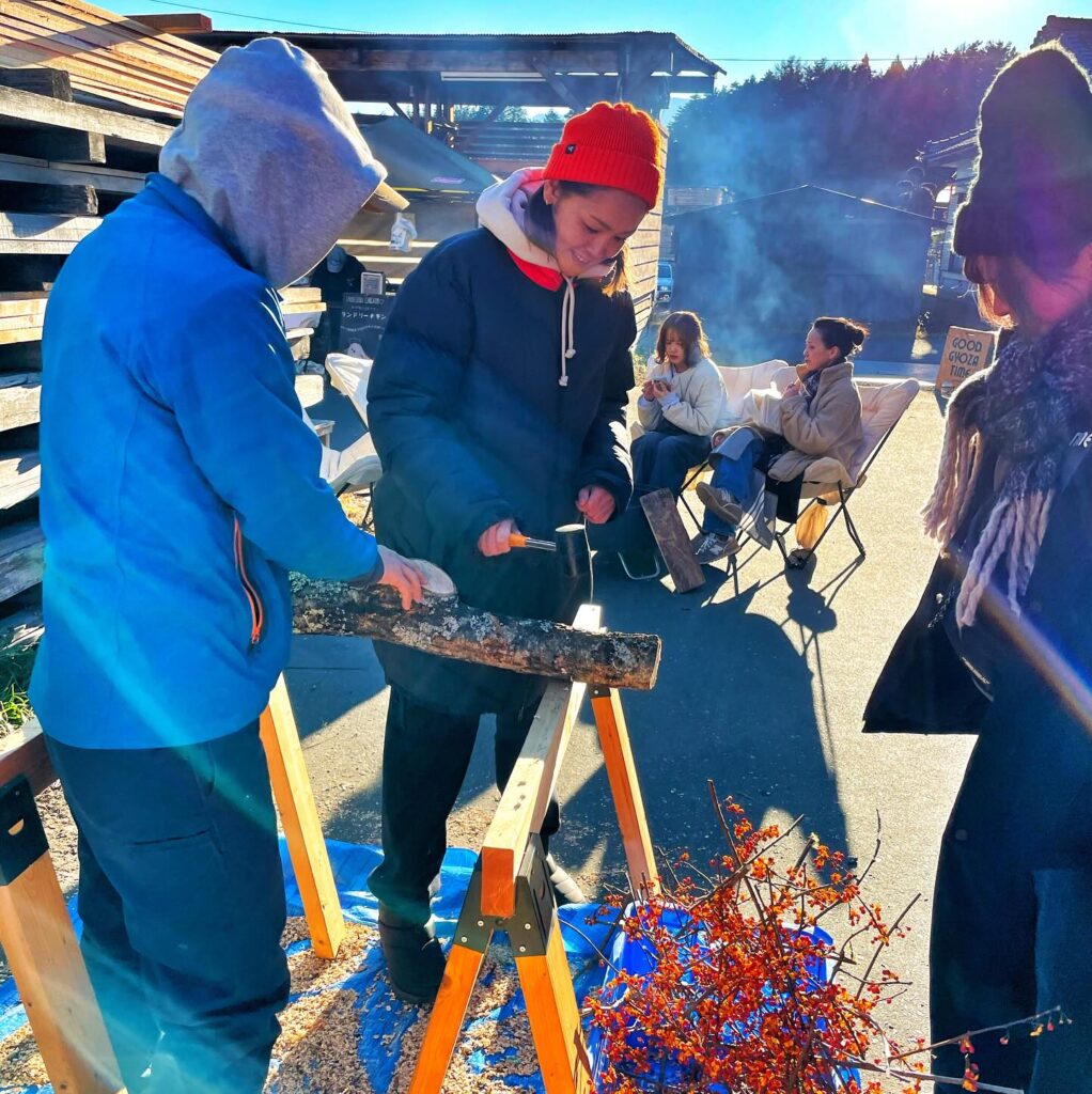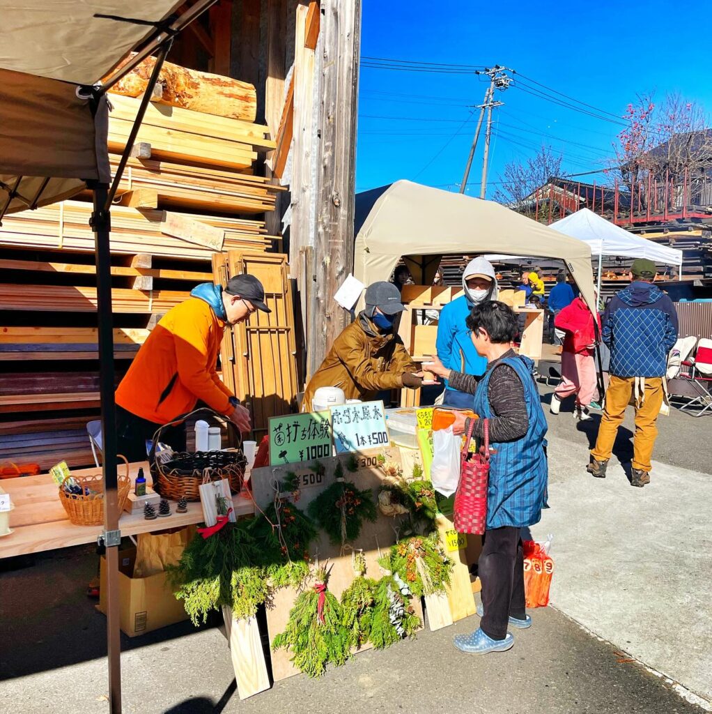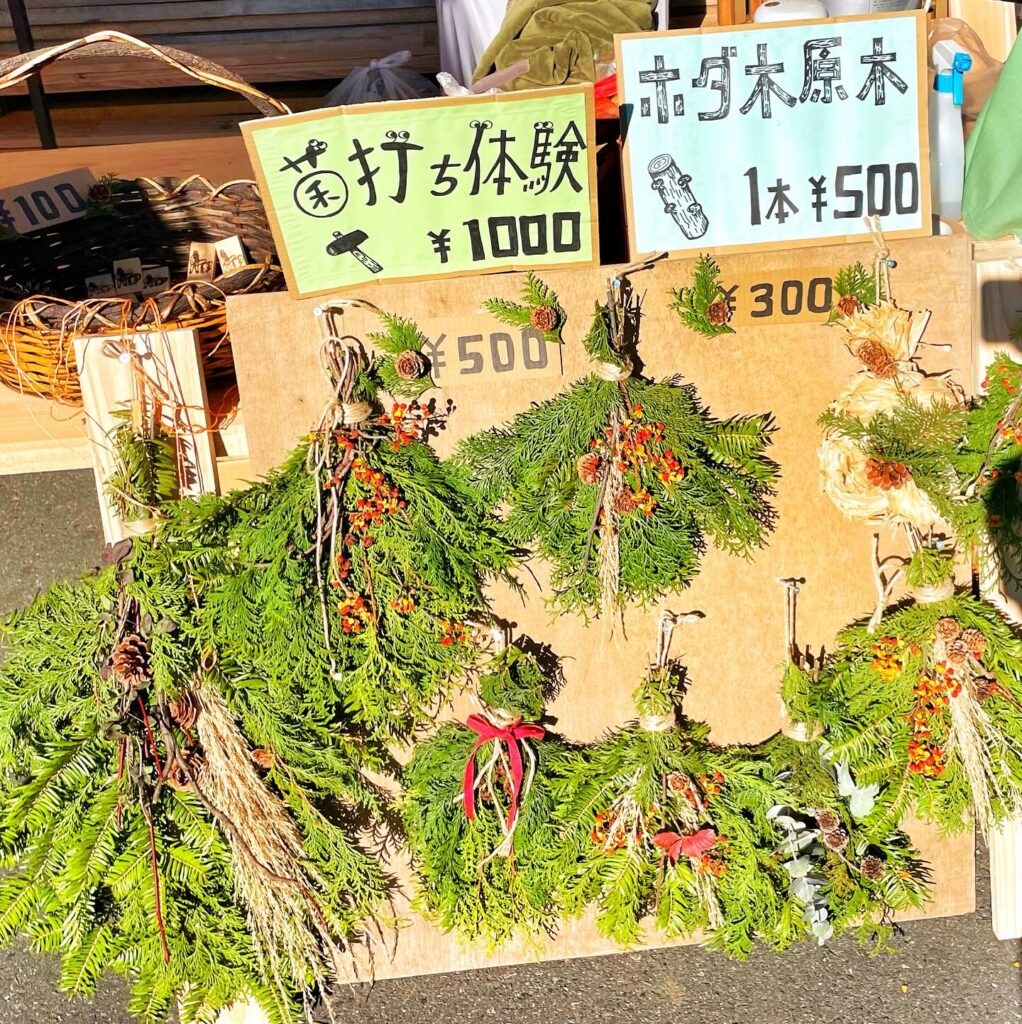 今回は山の施業時に採取した素材を使ってクロモジ茶、スワッグ、モルック、ナラのホダ木の菌打ち体験などを出展しました。